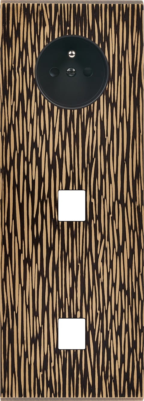 Façade Fascination en laiton massif finition Fauve triple verticale prise 2P+T 1 MEDIA 1 MEDIA mag. Dimensions : 80x222x5mm, deux chanfreins biseautés. Fabriqué en France dans les ateliers de Steaven Richard.