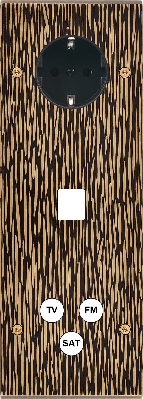 Façade Fascination en laiton massif finition Fauve triple verticale 1 prise Schuko 1 Media TVFMSAT à vis. Dimensions : 80x222x5mm, deux chanfreins biseautés. Fabriqué en France dans les ateliers de Steaven Richard.