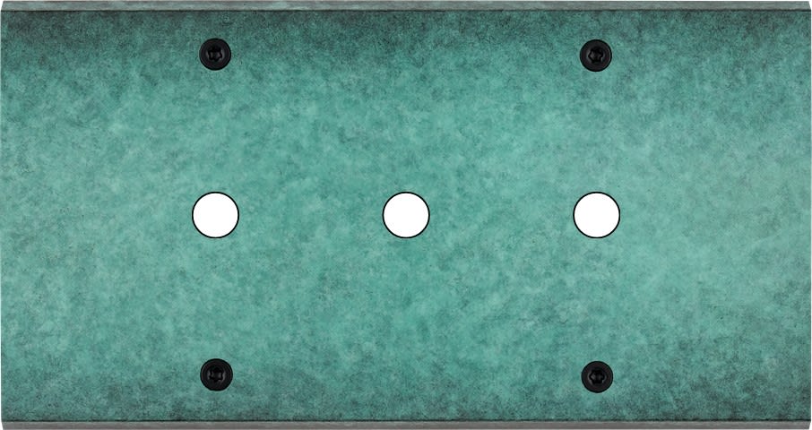 Façade Fascination en laiton massif finition Jade double horizontale 3 boutons poussoir PUSH à vis. Dimensions : 151x80x5mm, deux chanfreins biseautés. Fabriqué en France, dans les ateliers de Steaven Richard.