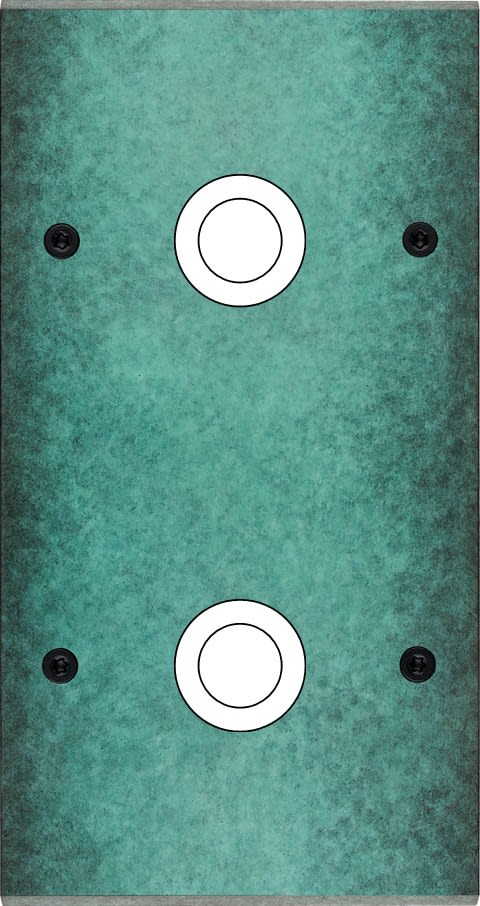Façade Fascination en laiton massif finition Jade double verticale 2 gros bouton poussoir PUSH à vis. Dimensions : 80x151x5mm, deux chanfreins biseautés. Fabriqué en France, dans les ateliers de Steaven Richard.