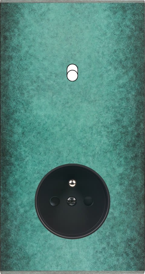 Façade Fascination en laiton massif finition Jade double verticale 1 basculeur prise 2P+T magnétique. Dimensions : 151x80x5mm, deux chanfreins biseautés. Fabriqué en France, dans les ateliers de Steaven Richard.