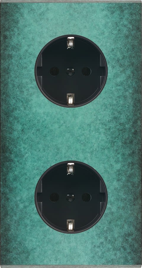 Façade Fascination en laiton massif finition Jade double verticale 2x 1 prise Schuko. Dimensions : 151x80x5mm, deux chanfreins biseautés. Fabriqué en France, dans les ateliers de Steaven Richard.