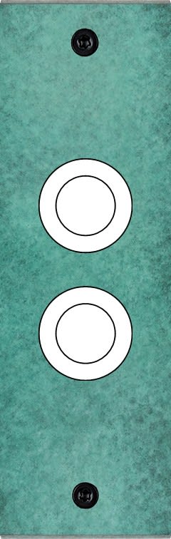 Façade Fascination en laiton massif finition Jade étroite longue 2 gros bouton poussoir PUSH à vis. Dimensions : 126x80x5mm, deux chanfreins biseautés. Fabriqué en France, dans les ateliers de Steaven Richard.