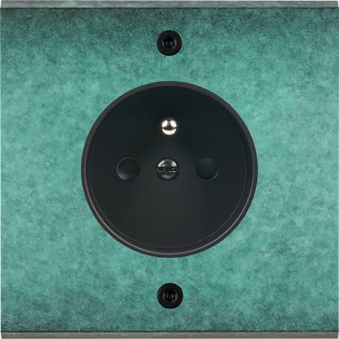 Façade Fascination en laiton massif finition Jade simple prise de courant 2P+T à vis. Dimensions : 80x80x5mm, deux chanfreins biseautés. Fabriqué en France, dans les ateliers de Steaven Richard.