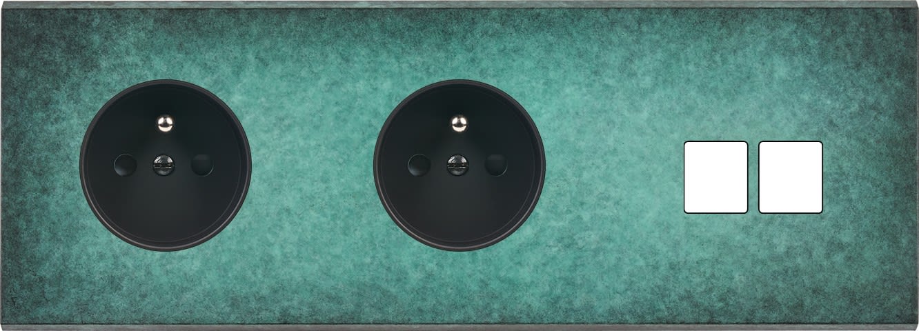 Façade Fascination en laiton massif finition Jade triple horizontale prise 2P+T prise 2P+T 2 Media magnétique. Dimensions : 222x80x5mm, deux chanfreins biseautés. Fabriqué en France, dans les ateliers de Steaven Richard.