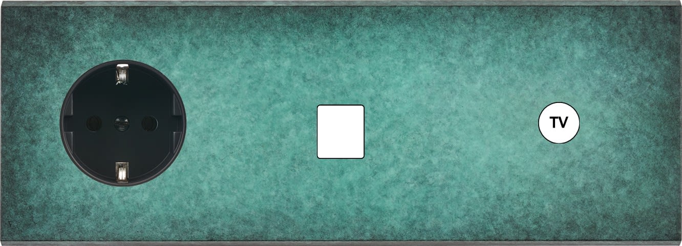 Façade Fascination en laiton massif finition Jade triple horizontale 1 prise Schuko 1 média 1 prise TV . Dimensions : 222x80x5mm, deux chanfreins biseautés. Fabriqué en France, dans les ateliers de Steaven Richard.