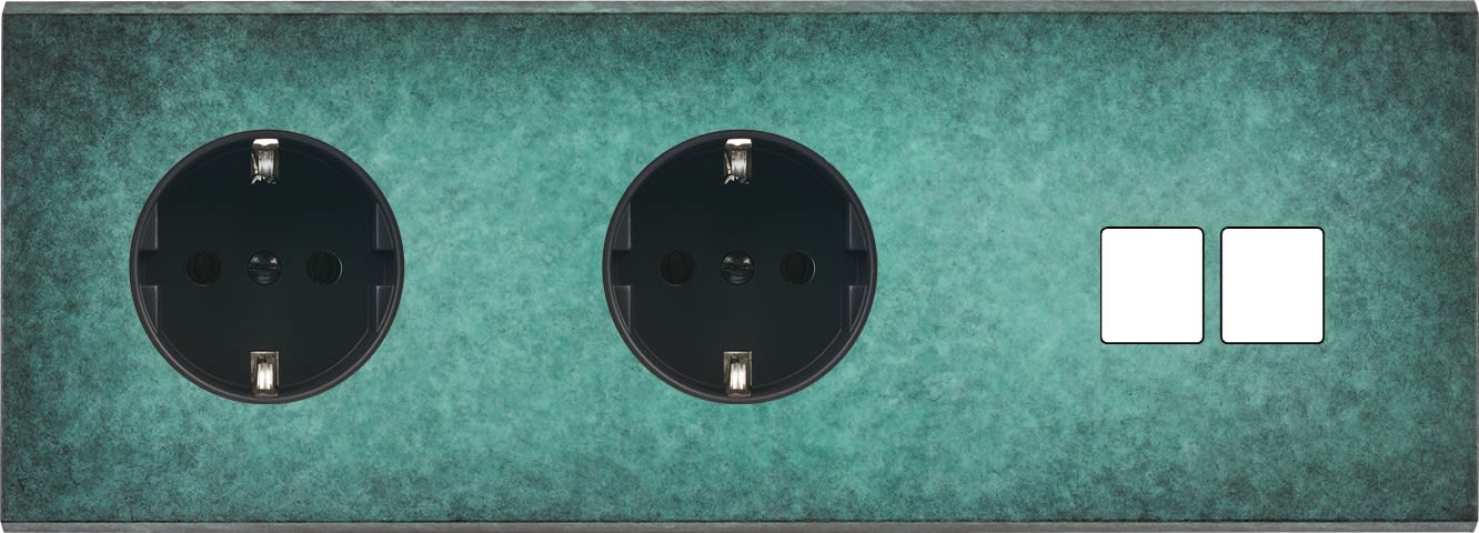 Façade Fascination en laiton massif finition Jade triple horizontale 1 prise Schuko 1 prise Schuko 2 Media . Dimensions : 222x80x5mm, deux chanfreins biseautés. Fabriqué en France, dans les ateliers de Steaven Richard.