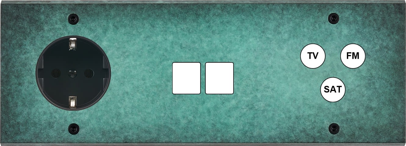 Façade Fascination en laiton massif finition Jade triple horizontale 1 prise Schuko 2 Media TVFMSAT à vis. Dimensions : 222x80x5mm, deux chanfreins biseautés. Fabriqué en France, dans les ateliers de Steaven Richard.