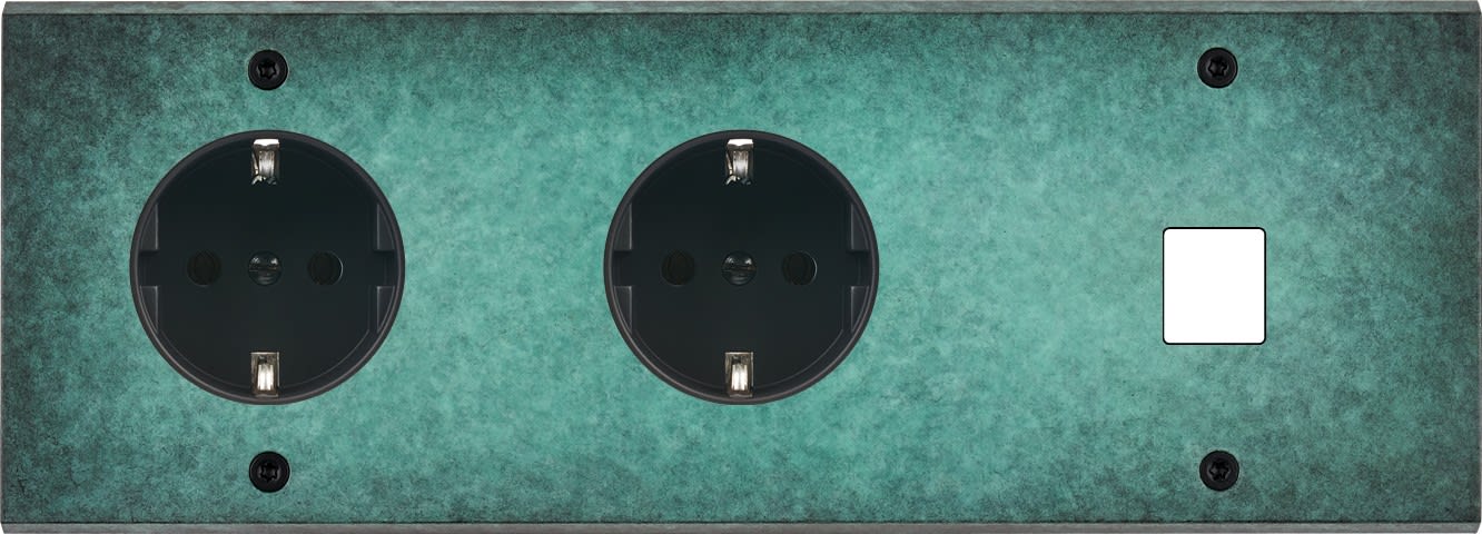 Façade Fascination en laiton massif finition Jade triple horizontale 1 prise Schuko 1 prise Schuko 1 MEDIA à vis. Dimensions : 222x80x5mm, deux chanfreins biseautés. Fabriqué en France, dans les ateliers de Steaven Richard.