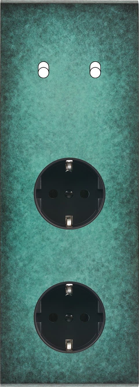 Façade Fascination en laiton massif finition Jade triple verticale 2 Basculeurs 1 prise Schuko 1 prise Schuko. Dimensions : 80x222x5mm, deux chanfreins biseautés. Fabriqué en France, dans les ateliers de Steaven Richard.