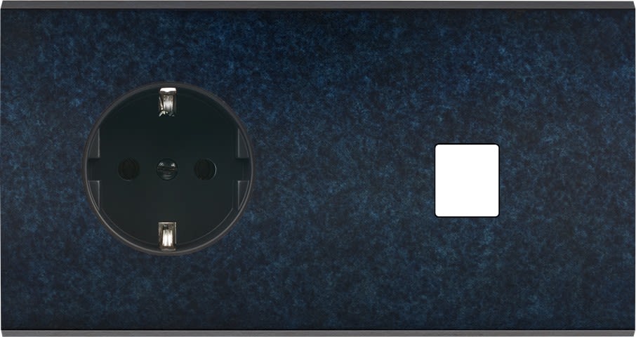 Façade Fascination en laiton massif finition Ombre double horizontale 1 prise Schuko 1 MEDIA magnétique. Dimensions : 80x80x5mm, deux chanfreins biseautés. Fabriqué en France, dans les ateliers de Steaven Richard.