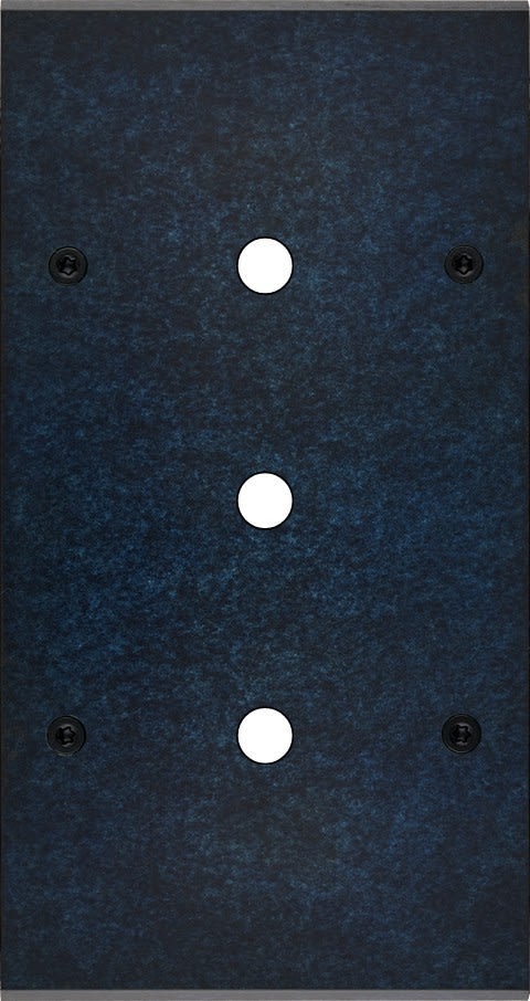 Façade Fascination en laiton massif finition Ombre double verticale 3 boutons poussoir PUSH à vis. Dimensions : 80x151x5mm, deux chanfreins biseautés. Fabriqué en France, dans les ateliers de Steaven Richard.