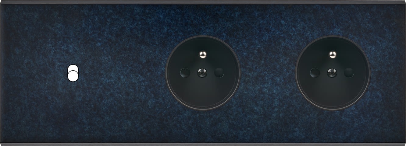 Façade Fascination en laiton massif finition Ombre triple horizontale 1 basculeur prise 2P+T prise 2P+T magnétique. Dimensions : 222x80x5mm, deux chanfreins biseautés. Fabriqué en France, dans les ateliers de Steaven Richard.