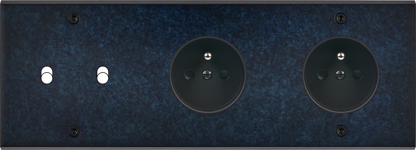 Façade Fascination en laiton massif finition Ombre triple horizontale 2 basculeurs prise de courant 2P+T prise de courant 2P+T à vis. Dim : 222x80x5mm, deux chanfreins biseautés. Fabriqué en France, dans les ateliers de Steaven Richard.