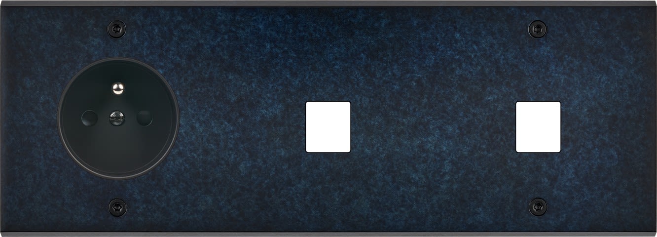 Façade Fascination en laiton massif finition Ombre triple horizontale prise de courant 2P+T 1 média 1 média à vis. Dimensions : 222x80x5mm, deux chanfreins biseautés. Fabriqué en France, dans les ateliers de Steaven Richard.