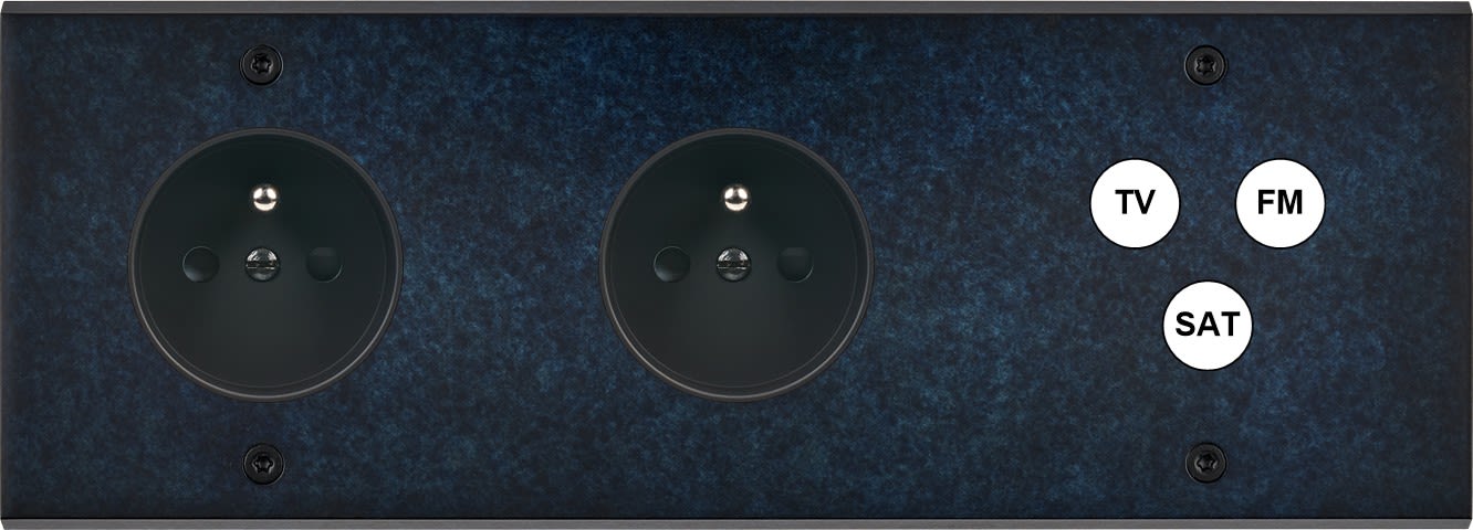 Façade Fascination en laiton massif finition Ombre triple horizontale prise de courant 2P+T prise de courant 2P+T 1 TV-FM-SAT à vis. Dim : 222x80x5mm, deux chanfreins biseautés. Fabriqué en France, dans les ateliers de Steaven Richard.