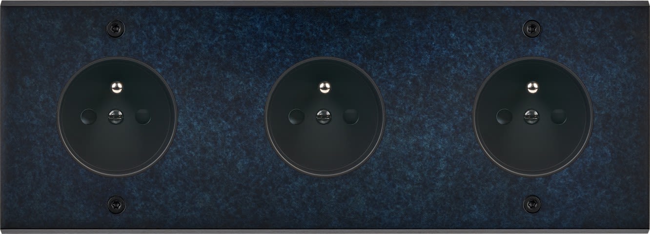 Façade Fascination en laiton massif finition Ombre triple horizontale prise de courant 2P+T prise de courant 2P+T prise de courant 2P+T à vis. Dim : 222x80x5mm, 2 chanfreins biseautés. Fabriqué en France dans les ateliers de Steaven Richard