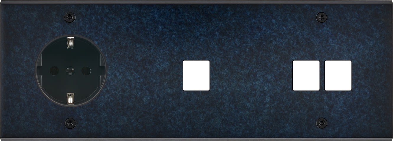 Façade Fascination en laiton massif finition Ombre triple horizontale 1 prise Schuko 1 Media 2 Media à vis. Dimensions : 222x80x5mm, deux chanfreins biseautés. Fabriqué en France, dans les ateliers de Steaven Richard.