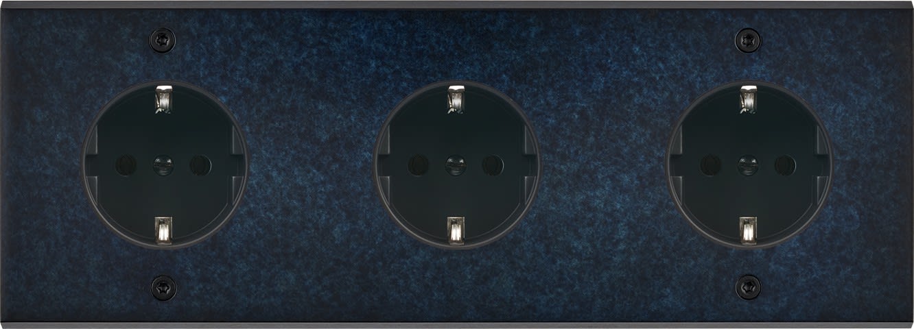 Façade Fascination en laiton massif finition Ombre triple horizontal 1 prise Schuko 1 prise Schuko 1 prise Schuko à vis. Dimensions : 222x80x5mm, deux chanfreins biseautés. Fabriqué en France, dans les ateliers de Steaven Richard.