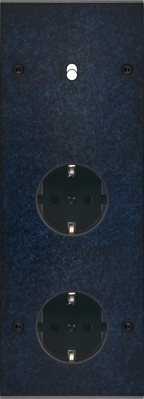 Façade Fascination en laiton massif finition Ombre triple verticale 1 Basculeur 1 prise Schuko 1 prise Schuko à vis. Dimensions : 80x222x5mm, deux chanfreins biseautés. Fabriqué en France, dans les ateliers de Steaven Richard.