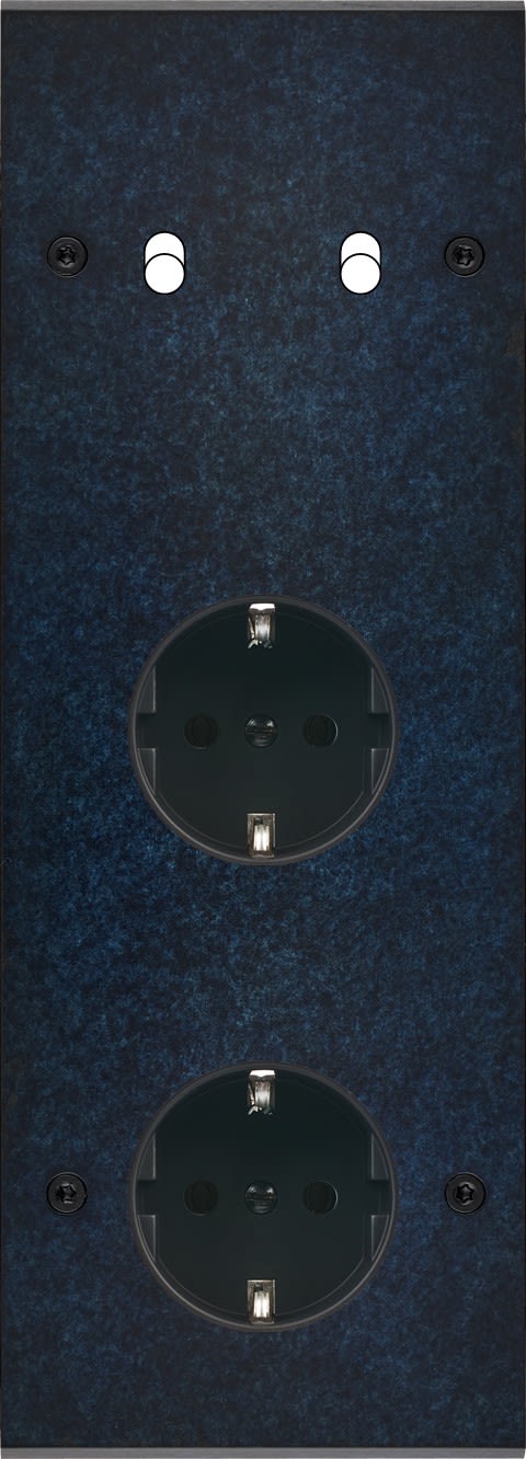 Façade Fascination en laiton massif finition Ombre triple verticale 2 Basculeurs 1 prise Schuko 1 prise Schuko à vis. Dimensions : 80x222x5mm, deux chanfreins biseautés. Fabriqué en France, dans les ateliers de Steaven Richard.
