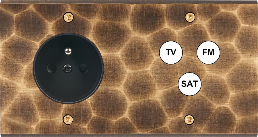Façade Fascination en laiton massif finition Onde double horizontale prise de courant 2P+T 1 TV-FM-SAT à vis. Dimensions : 151x80x5mm, deux chanfreins biseautés. Fabriqué en France, dans les ateliers de Steaven Richard.