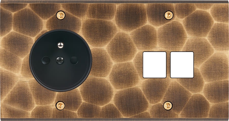 Façade Fascination en laiton massif finition Onde double horizontale prise de courant 2P+T 2 média à vis. Dimensions : 151x80x5mm, deux chanfreins biseautés. Fabriqué en France, dans les ateliers de Steaven Richard.