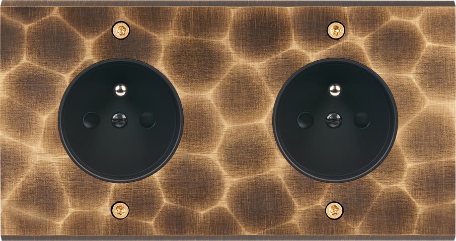 Façade Fascination en laiton massif finition Onde double horizontale prise de courant 2P+T prise de courant 2P+T à vis. Dimensions : 151x80x5mm, deux chanfreins biseautés. Fabriqué en France, dans les ateliers de Steaven Richard.