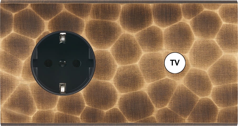 Façade Fascination en laiton massif finition Onde double horizontale 1 prise Schuko 1 prise TV. Dimensions : 80x80x5mm, deux chanfreins biseautés. Fabriqué en France, dans les ateliers de Steaven Richard.