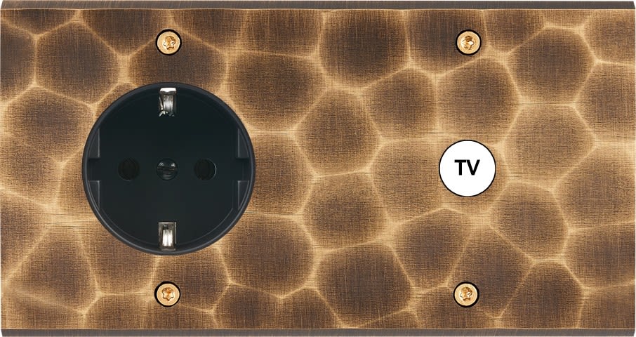 Façade Fascination en laiton massif finition Onde double horizontale 1 prise Schuko 1 prise TV à vis. Dimensions : 80x80x5mm, deux chanfreins biseautés. Fabriqué en France, dans les ateliers de Steaven Richard.