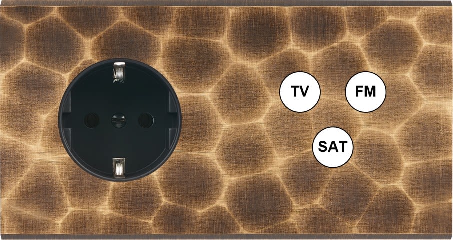 Façade Fascination en laiton massif finition Onde double horizontale 1 prise Schuko TVFMSAT magnétique. Dimensions : 80x80x5mm, deux chanfreins biseautés. Fabriqué en France, dans les ateliers de Steaven Richard.
