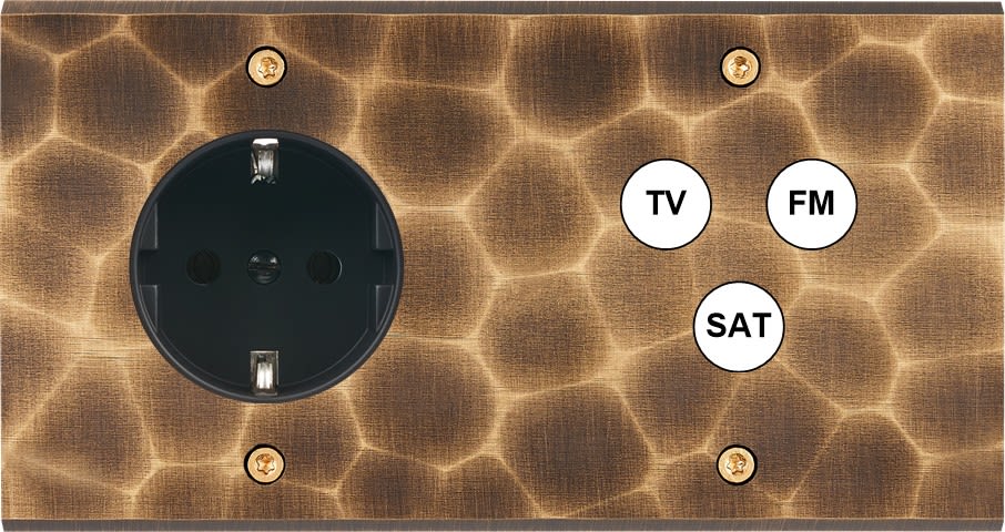 Façade Fascination en laiton massif finition Onde double horizontale 1 prise Schuko TVFMSAT à vis. Dimensions : 80x80x5mm, deux chanfreins biseautés. Fabriqué en France, dans les ateliers de Steaven Richard.