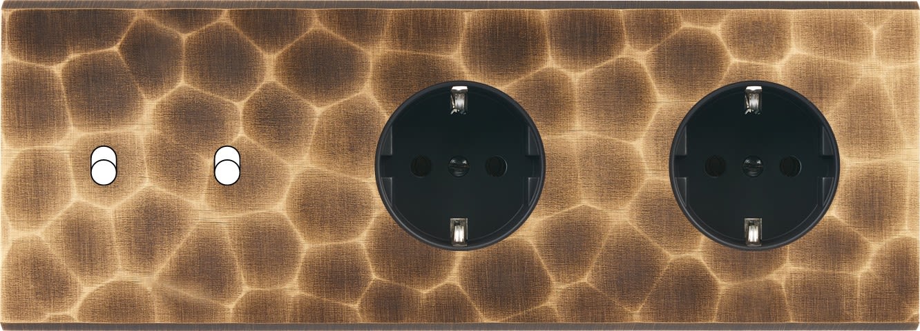 Façade Fascination en laiton massif finition Onde triple horizontale 2 Basculeurs 1 prise Schuko 1 prise Schuko. Dimensions : 222x80x5mm, deux chanfreins biseautés. Fabriqué en France, dans les ateliers de Steaven Richard.
