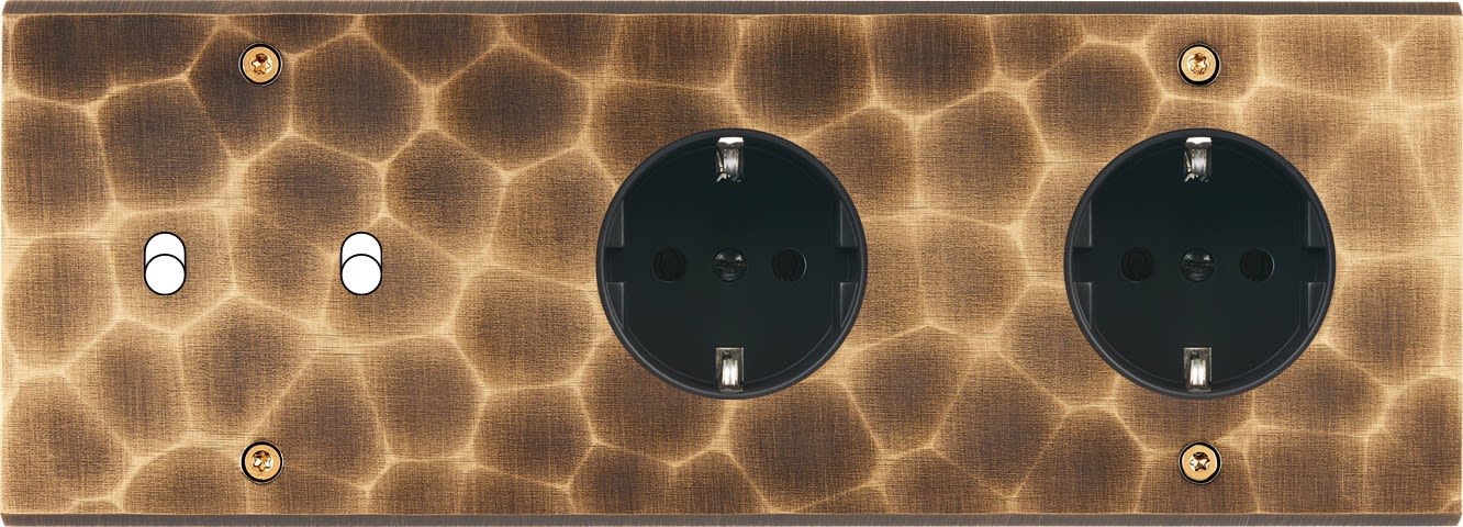 Façade Fascination en laiton massif finition Onde triple horizontale 2 Basculeurs 1 prise Schuko 1 prise Schuko à vis. Dimensions : 222x80x5mm, deux chanfreins biseautés. Fabriqué en France, dans les ateliers de Steaven Richard.