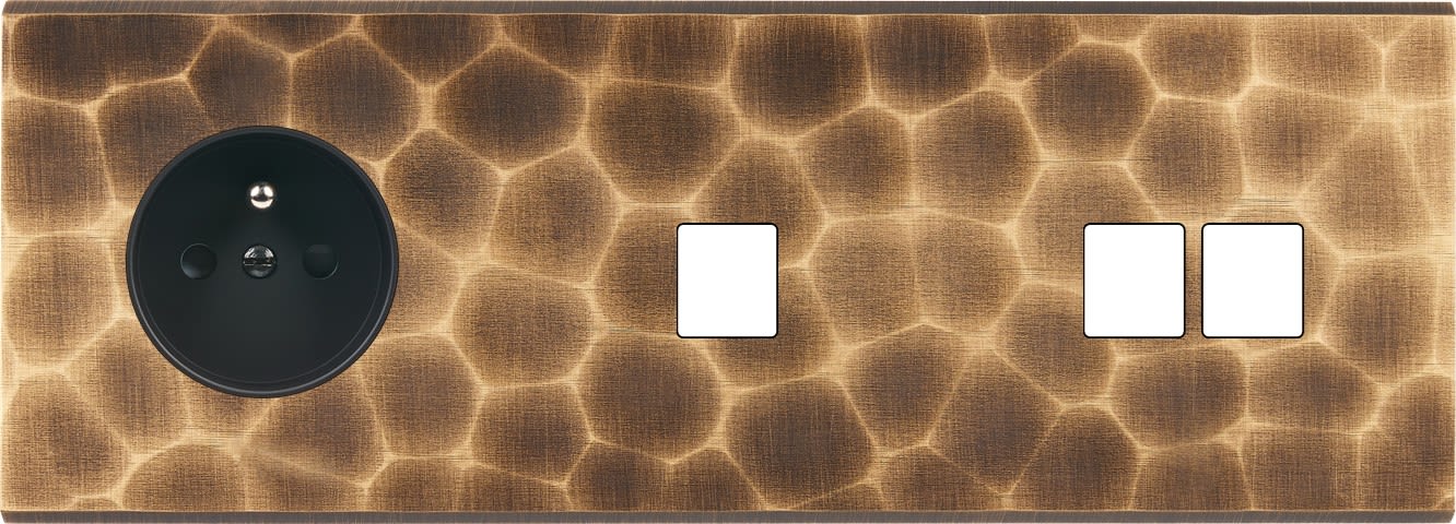Façade Fascination en laiton massif finition Onde triple horizontale prise 2P+T 1 Media 2 Media . Dimensions : 222x80x5mm, deux chanfreins biseautés. Fabriqué en France, dans les ateliers de Steaven Richard.