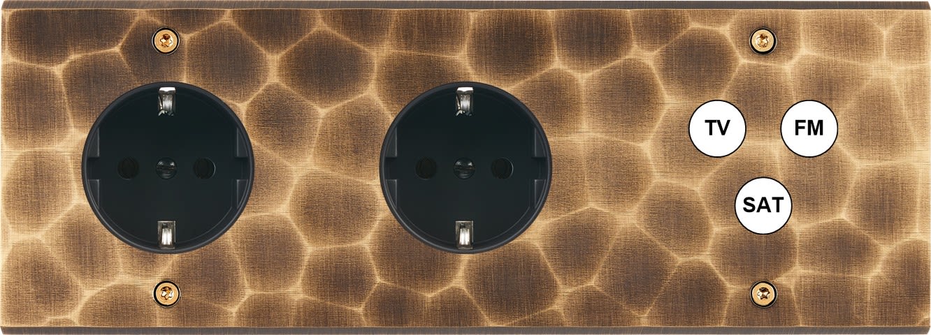 Façade Fascination en laiton massif finition Onde triple horizontale 1 prise Schuko 1 prise Schuko TVFMSAT à vis. Dimensions : 222x80x5mm, deux chanfreins biseautés. Fabriqué en France, dans les ateliers de Steaven Richard.