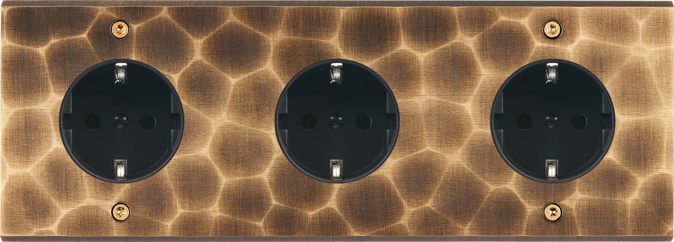 Façade Fascination en laiton massif finition Onde triple horizontal 1 prise Schuko 1 prise Schuko 1 prise Schuko à vis. Dimensions : 222x80x5mm, deux chanfreins biseautés. Fabriqué en France, dans les ateliers de Steaven Richard.