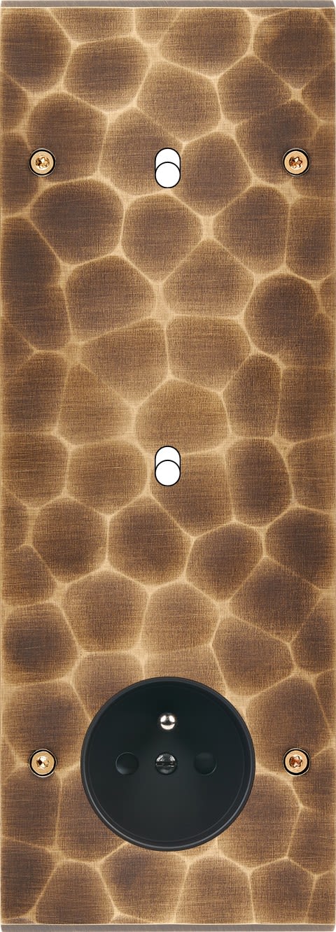 Façade Fascination en laiton massif finition Onde triple verticale 1 basculeur 1 basculeur prise de courant 2P+T à vis. Dimensions : 80x222x5mm, deux chanfreins biseautés. Fabriqué en France, dans les ateliers de Steaven Richard.