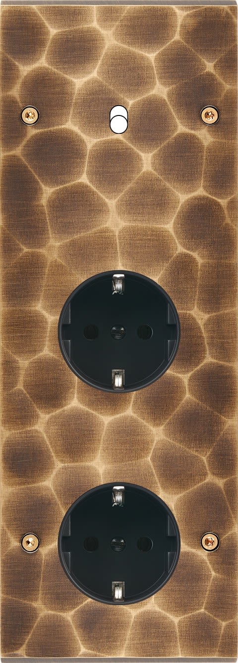 Façade Fascination en laiton massif finition Onde triple verticale 1 Basculeur 1 prise Schuko 1 prise Schuko à vis. Dimensions : 80x222x5mm, deux chanfreins biseautés. Fabriqué en France, dans les ateliers de Steaven Richard.