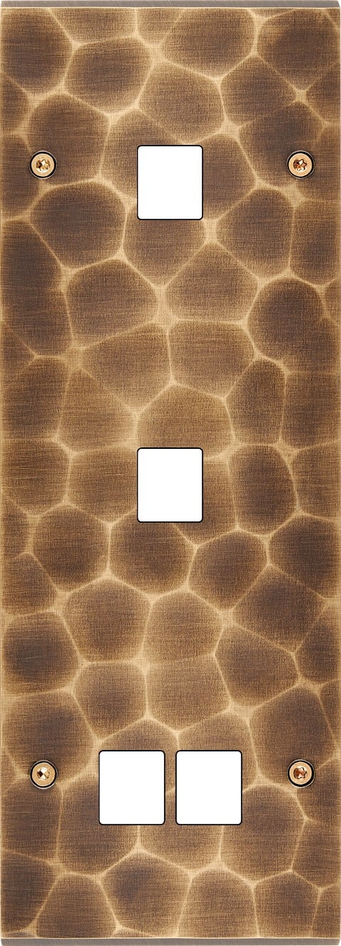 Laiton massif 5mm - Format triple verticale 80x222mm - 6 finitions disponibles et plus de 50 fonctions - Montage sur boîtiers standards profondeur 50mm - Façade à vis