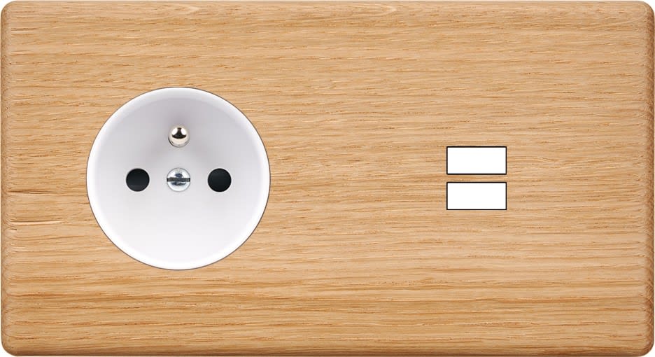 Façade Hitera Chêne Clair double horizontale prise de courant 2P T / ouverture pour chargeur double USB. En bois massif. Fabriqué en France.
