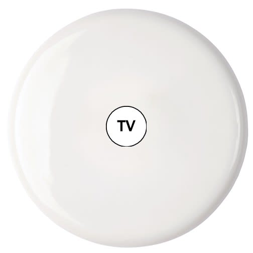 Façade Iris by MODELEC en porcelaine blanche simple poste prise TV. Dimensions de la façade : diamètre 84mm +/-1mm, profondeur 7,5mm. Se monte sur un boitier d'encastrement standard Ø67-68 mm de profondeur 50 mm.