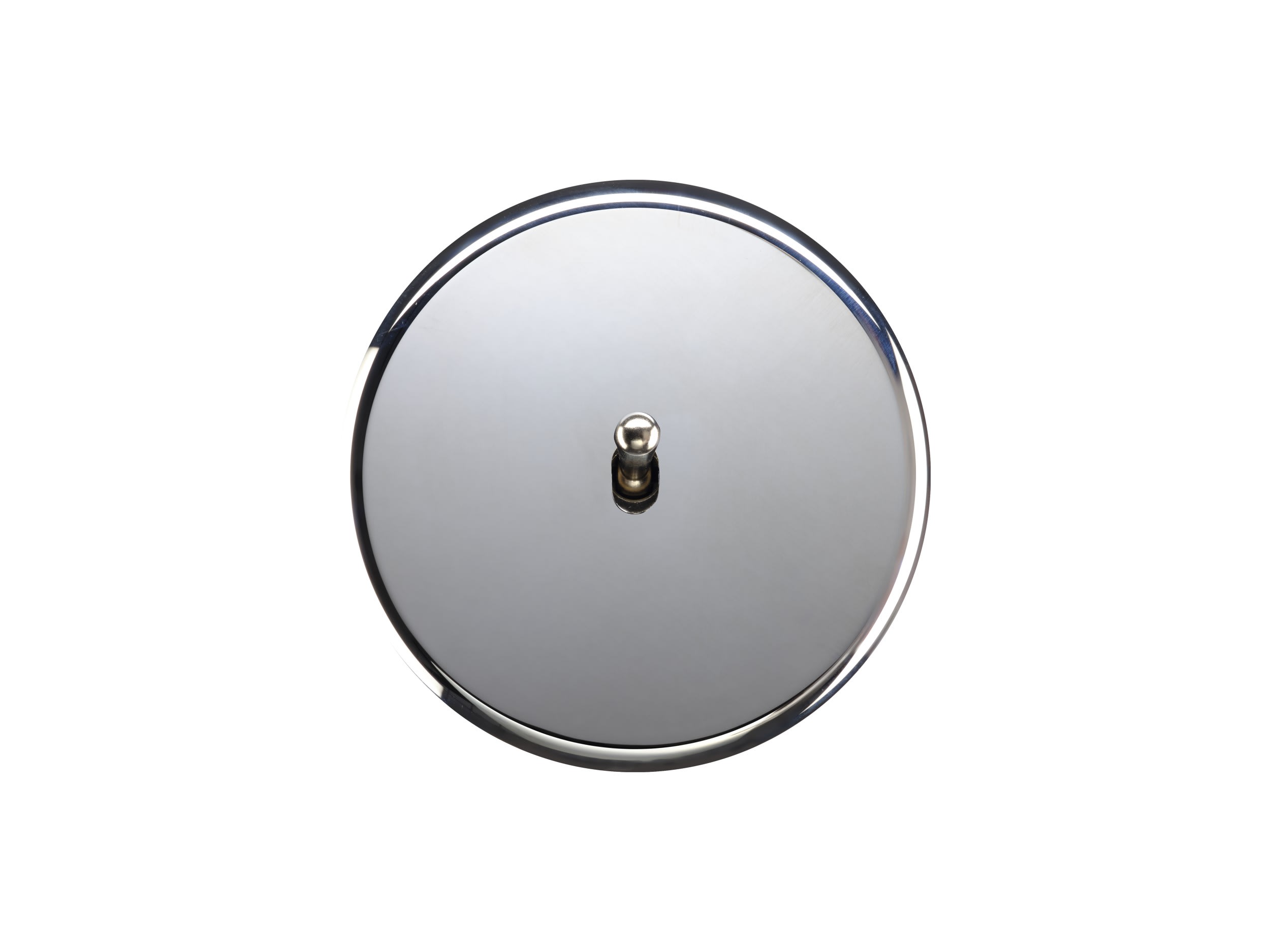 Façade Iris Horizon en laiton, finition chrome miroir, simple poste, pour un basculeur. Façade magnétique. Dimensions : diamètre 79,5mm, profondeur 7,5mm. Se monte sur un boitier d'encastrement standard Ø67-68 mm de profondeur 50 mm.