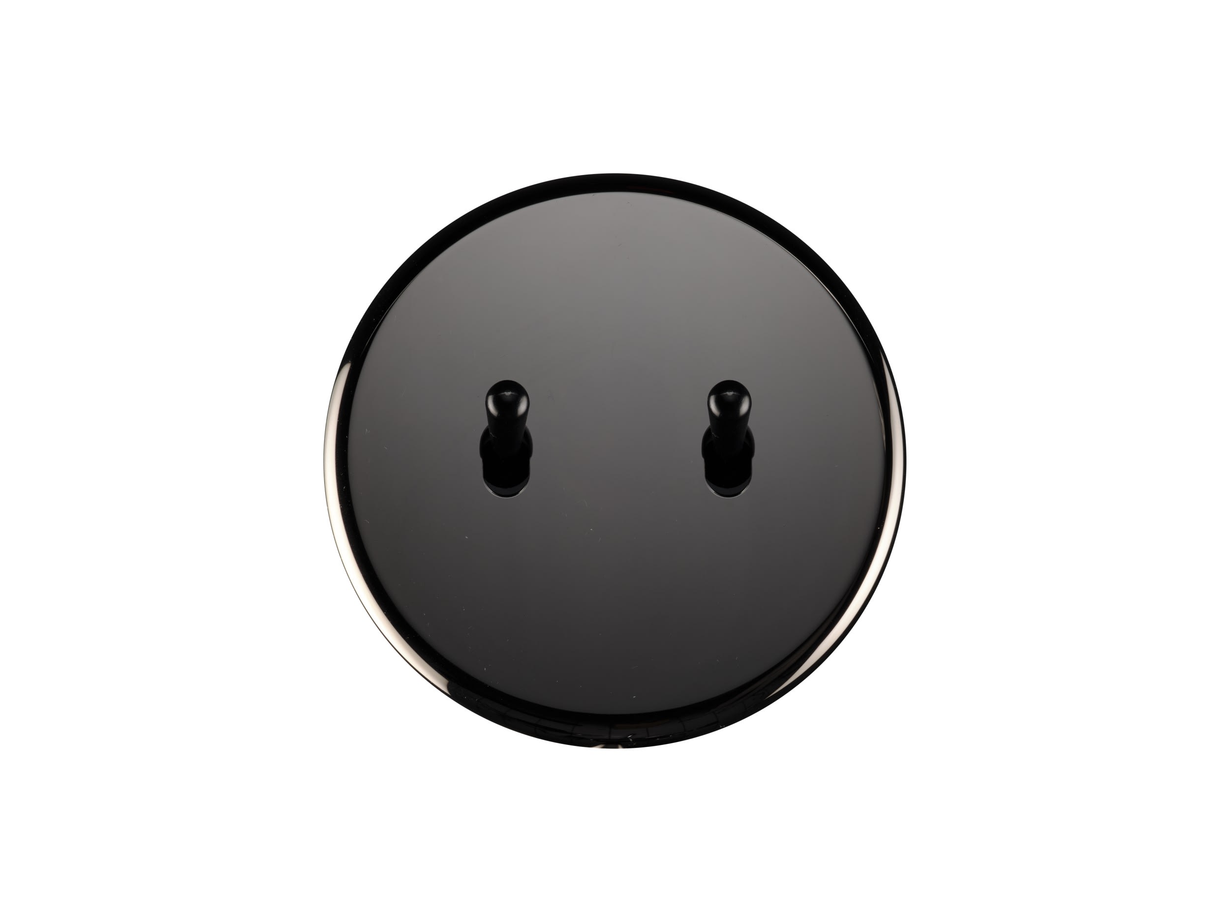 Façade Iris Horizon en laiton, finition nickel noir miroir, simple poste, pour deux basculeurs. Façade magnétique. Dimensions : diamètre 79,5mm, profondeur 7,5mm. Se monte sur un boitier d'encastrement standard Ø67-68 mm de profondeur 50 mm