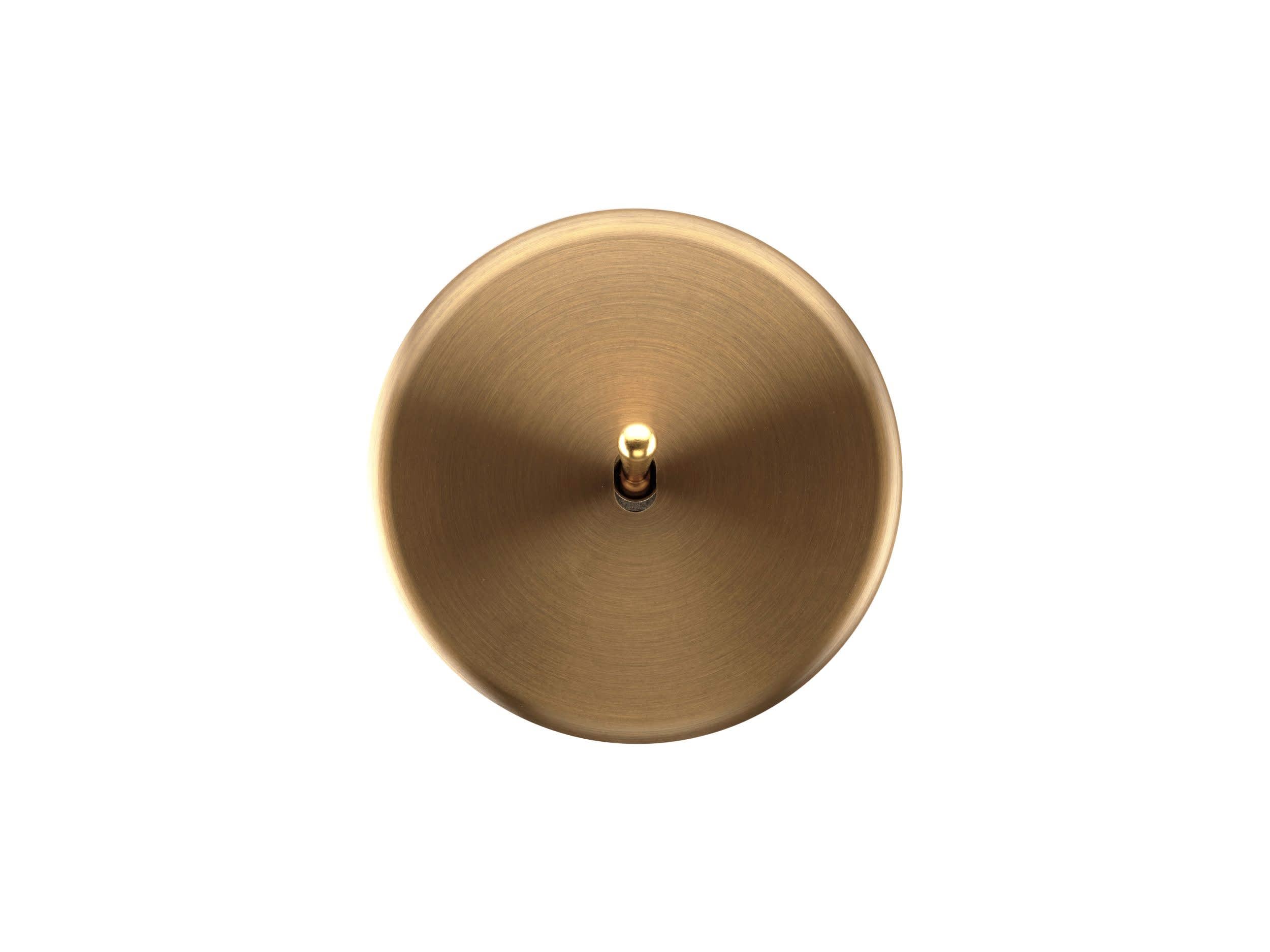 Façade Iris Horizon en laiton, finition laiton vieux bronze satiné, simple poste, prise schuko. Façade magnétique. Dim : diamètre 79,5mm, profondeur 7,5mm. Se monte sur un boitier d'encastrement standard Ø67-68 mm de profondeur 50 mm.