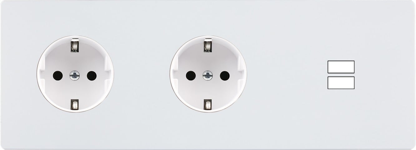 Façade "M" en aluminium finition Blanc Mat triple horizontale, 1 prise Schuko / 1 prise Schuko / 1 chargeur USB. Façade magnétique. Fabriquée en France