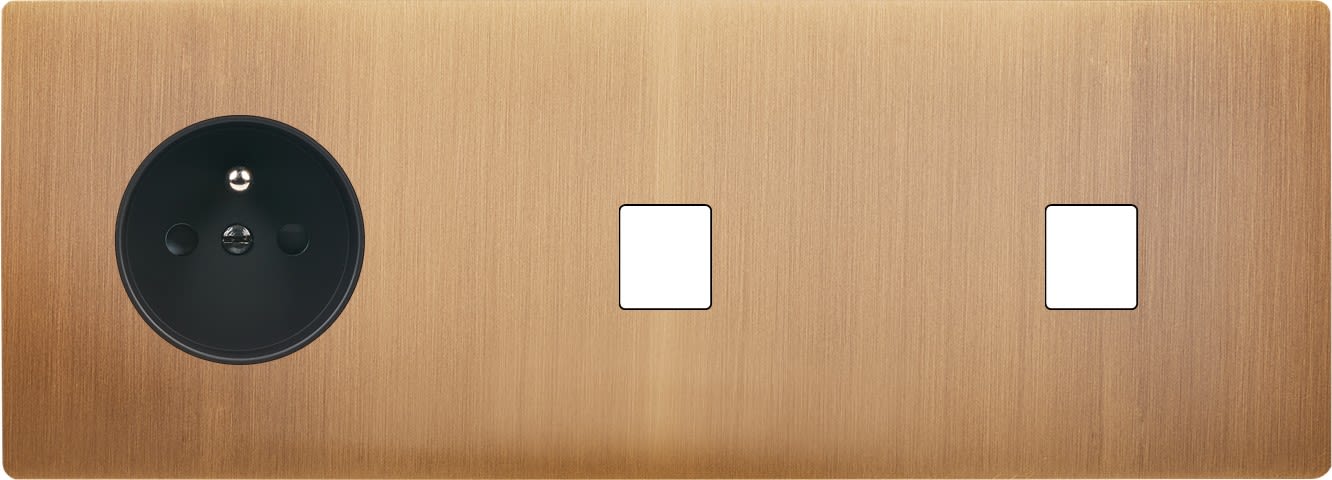 Façade "M" en laiton massif finition Vieux Bronze Triple horizontale, 1 prise de courant 2P+T / 1 Media 1 Media. Façade magnétique. Fabriquée en France.