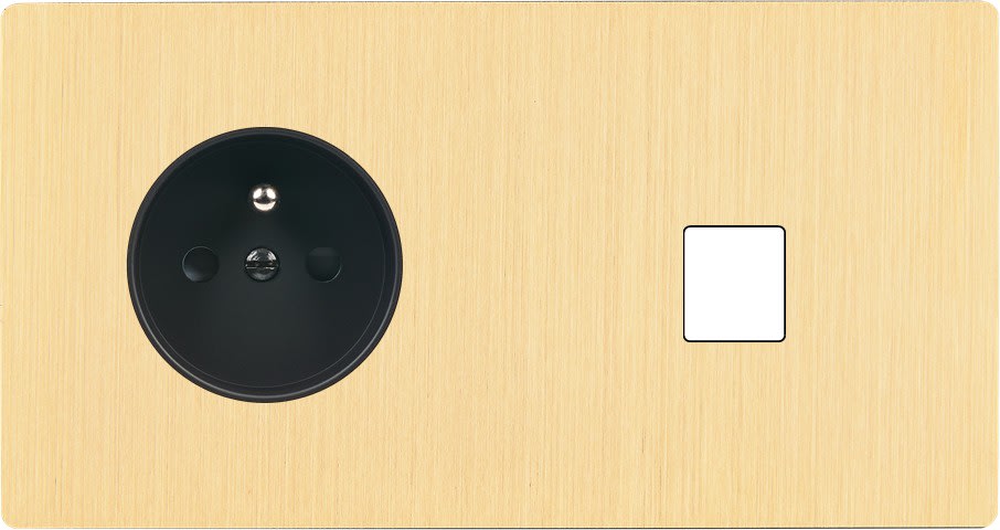 Façade "M" en laiton brossé double horizontale, 1 prise de courant 2P+T / 1 media. Façade magnétique. Fabriquée en France.