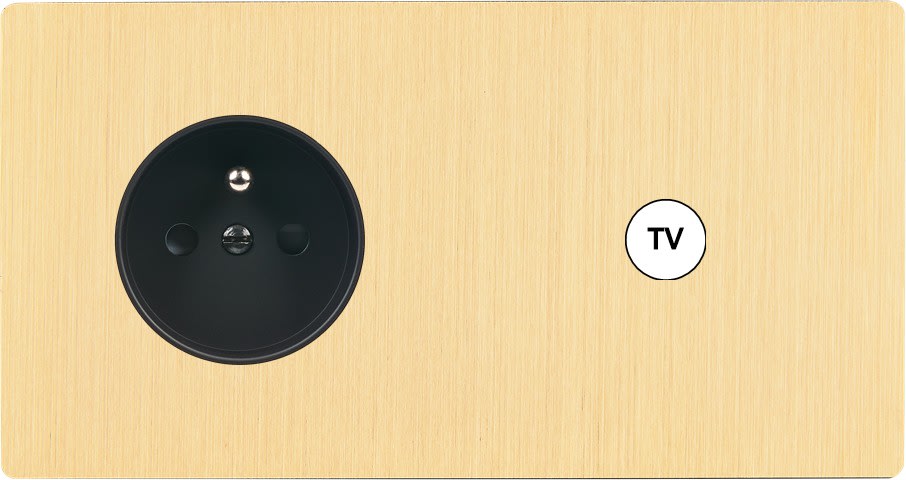 Façade "M" en laiton brossé double horizontale, 1 prise de courant 2P+T /1 prise tv. Façade magnétique. Fabriquée en France.