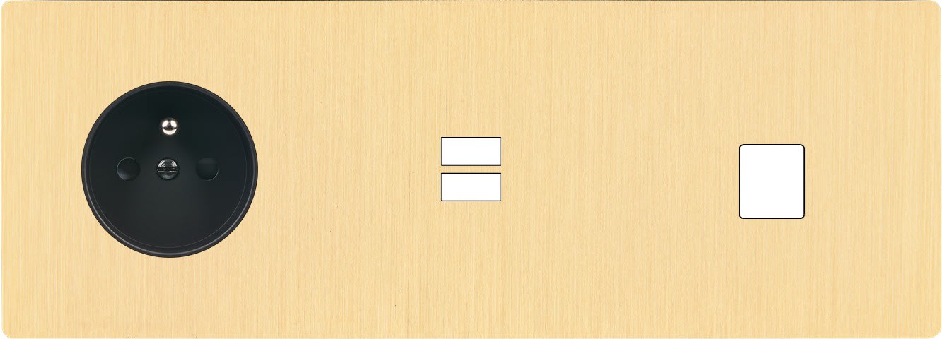 Façade "M" en laiton brossé triple horizontale, 1 prise 2P+T / 1 chargeur USB / 1 media. Façade magnétique. Fabriquée en France.